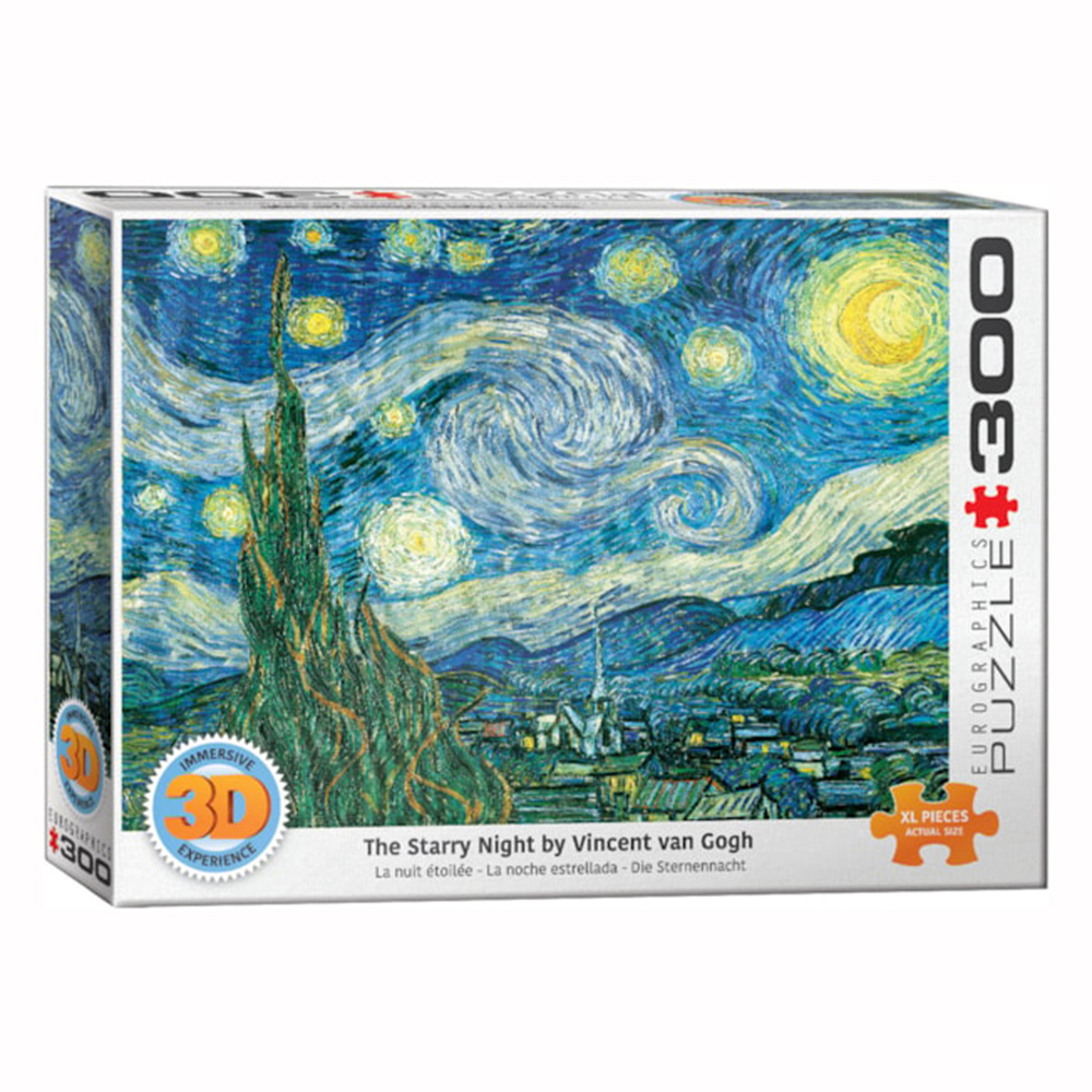 See Van Gogh's Starry Night in an entirely new way with this lenticular puzzle. Lenticular puzzles have a very unique effect; when you look at them from different angles. A fun, challenging, and unique puzzling experience for the entire family. The pieces are oversized.