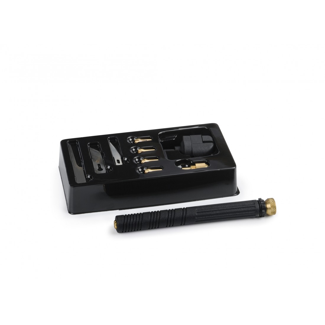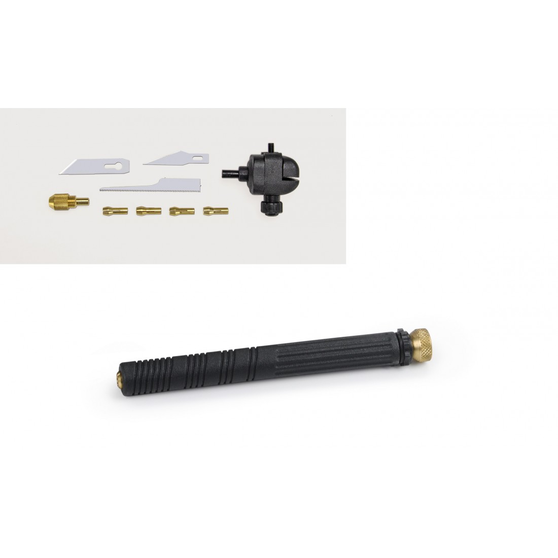 Action Kit är ett oumbärligt set för alla modellbyggare och kombinerar praktisk funktionalitet med robust konstruktion. Kniven med obrytbar nylonhandtag och mässingshylsa ger ett stadigt och bekvämt grepp. Tack vare frontinfästningen kan kniven användas med alla typer av blad och en mängd olika tillbehör.