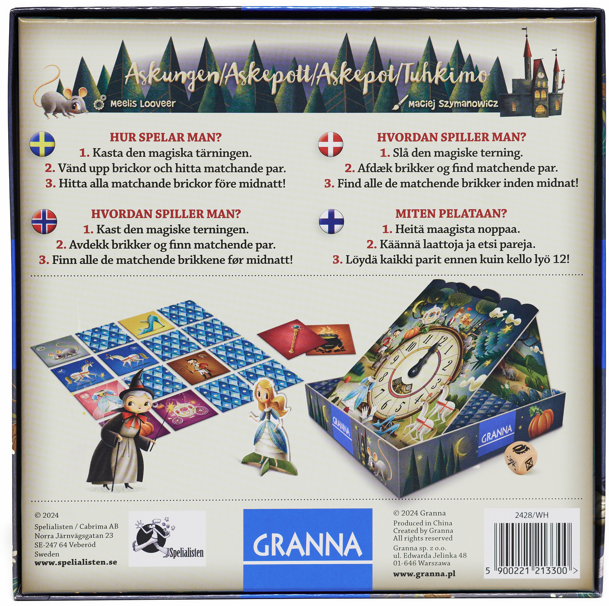 Askungen (Svenska) är ett charmigt och spännande samarbetsspel som låter de minsta barnen kliva in i sagans värld. Här tävlar ni inte mot varandra, utan samarbetar som goda fey-hjälpare för att se till att Askungen hinner till balen i tid!