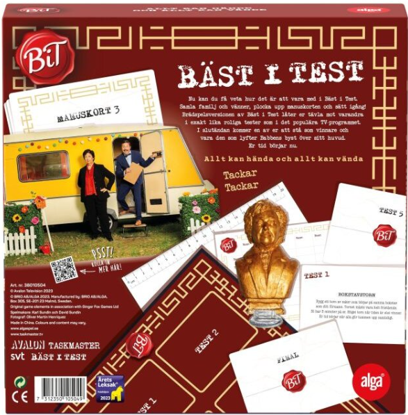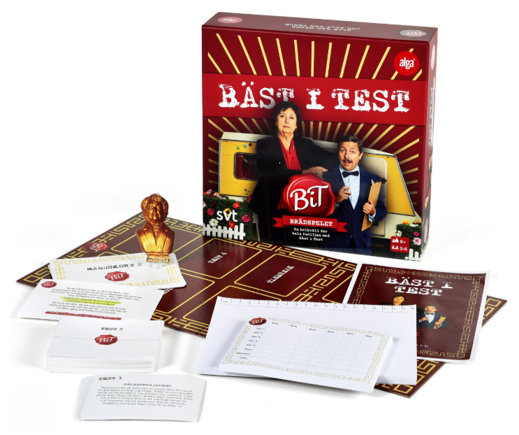 lika roliga tester som i det populära TV-programmet.Nu kan du få veta hur det är att vara med i Bäst i Test. Samla familj och vänner, plocka upp manuskorten och kör igång! Brädspelsversionen av Bäst i Test låter er tävla mot varandra i minst lika roliga tester som i det populära TV-programmet. Alla turas om att vara Babben och David och i slutändan
