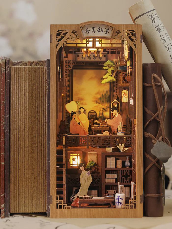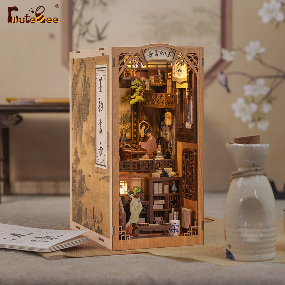 CUTEBEE DIY Book Nook Kit | Ink Rhyme Bookstore låter dig skapa en elegant och inspirerande studiehörna mitt i din bokhylla. Varje detalj är noggrant utformad – från blommor och växter till klassiska bokhyllor och dekorativa föremål – vilket skapar en intellektuell och estetiskt tilltalande miniatyrvärld, isolerad från världens brus.