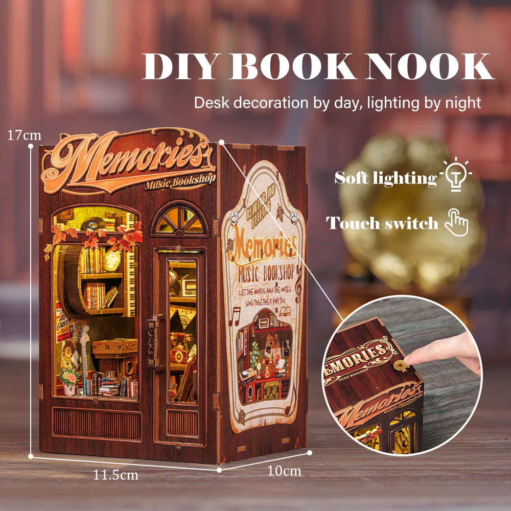Memories Music Bookshop är ett DIY-miniatyrhus byggt i premiumträ och noggrant utvalda material. Byggsatsen innehåller 136 delar och är enkel nog för nybörjare, men ger ändå en engagerande och avkopplande byggupplevelse. Den färdiga modellen blir en charmig dekoration och ett samlarobjekt med både ljus och rörliga delar.