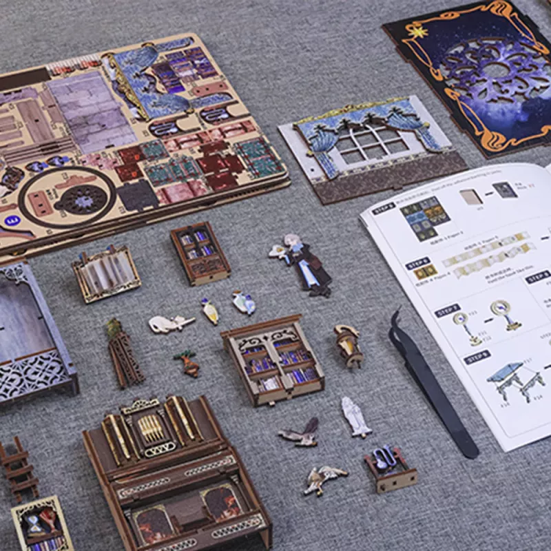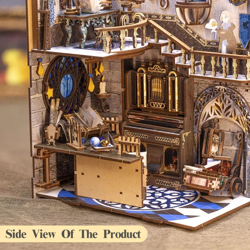 - Design och Detaljnivå: Skapa en harmonisk miniatyrvärld med magiska element och djur på ena sidan, samt stjärnor och föremål på den andra. Inkluderar en drömlik magikerstudio, observatorium med teleskop, planetarier och böcker, samt möbler och små detaljer som pianon och flygande örnar.