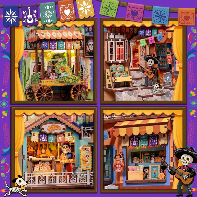 CUTEBEE DIY Book Nook Kit | Plaza de los Muertos tar dig till en färgsprakande hyllning av livet inspirerad av den mexikanska traditionen Día de los Muertos. Detta miniatyrhus fångar festivalens anda – där minnen firas med glädje och livet hedras bortom tid.