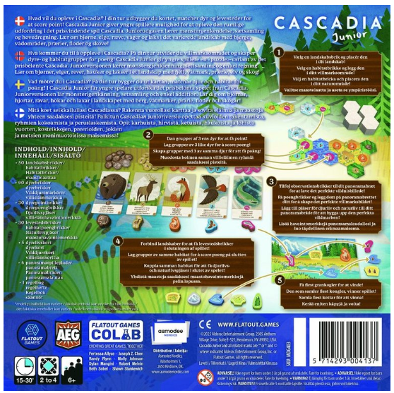 I din tur bygger du ut din karta och matchar djur och livsmiljöer för att lägga till observationer i ditt panorama och samla poäng! Cascadia Junior låter yngre spelare uppleva det rumsliga pusslet från det prisbelönta brädspelet Cascadia. Det här fristående spelet lär ut mönsterbyggande, set-samling och grundläggande addition. Lär dig om björnar, hökar, älgar, laxar och rävar i detta varierade landskap av berg, våtmarker, prärier, floder och skogar!