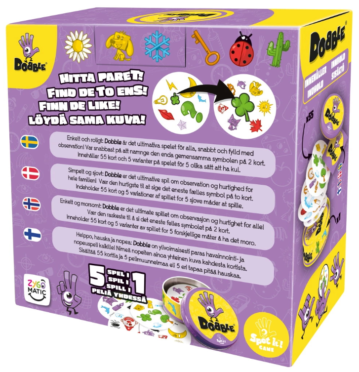 Dobble är ett roligt familjespel med 55 olika kort med olika symboler där det gäller att snabbt hitta de identiska symbolerna. De olika symbolerna i Dobble varierar i storlek och placering vilket ger ett roligt, utmanande och varierande spel som passar både barn och vuxna. Det är ett lättspelat familjespel som är snabbt att komma igång med.