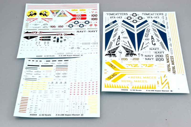 F/A-18E Super Hornet är en detaljerad plastbyggsats i skala 1:32 som återger den avancerade varianten av F/A-18 Hornet. Flygplanet har längre flygkropp, större vingar och kraftfullare motorer, vilket gör att det kan bära mer bränsle och vapen samt återvända till hangarfartyg med större "bringback". Super Hornet flög första gången 1995 och togs i tjänst av US Navy 1999.