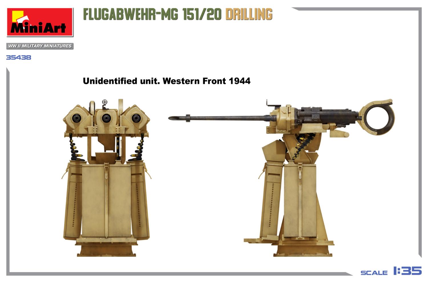 MiniArt 35438 FLUGABWEHR-MG 151/20 DRILLING är ett detaljerat modellkit i skala 1:35 av den tyska trippelluftvärnskanonställningen från andra världskriget. Modellen återger noggrant ett av de viktigaste vapnen som användes under krigets senare år.