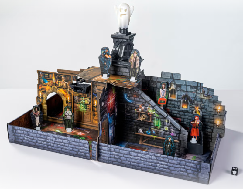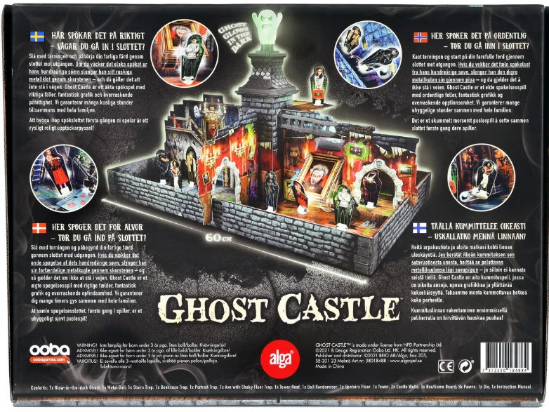 Du är högst upp i spökslottet när du inser att ryktena om spöket är sanna. Slå med tärningen och påbörja din farliga färd mot utgången. Om du väcker det elaka spöket ur hans hundraåriga sömn slungar han sitt ruskiga metallklot genom skorstenen och då gäller det att inte stå på fel plats. Ett äkta spökspel med riktiga fällor, fantastisk grafik och överraskande påhittighet.