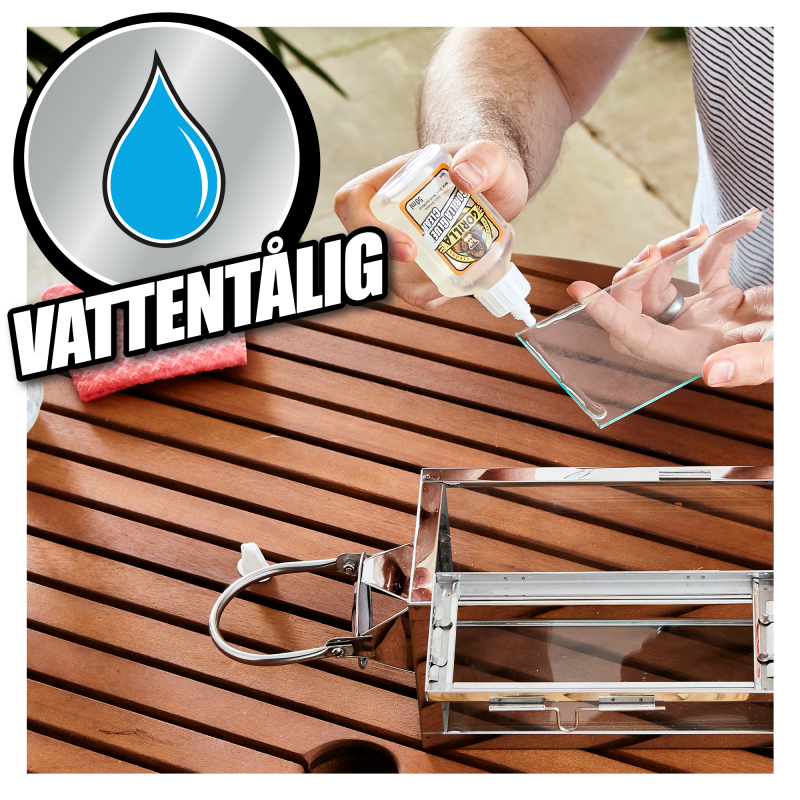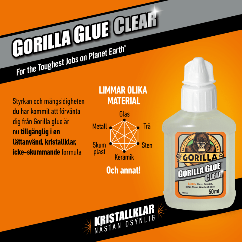Med sin unika formula kombinerar Gorilla Glue Clear extrem mångsidighet med enkel användning. Det fäster på nästan allt – från trä och sten till glas och metall. Eftersom det är vattenavvisande och tål temperaturer från -30°C till 90°C är det också ett tryggt val för modeller som ska tåla hantering eller förvaras i varierande miljöer.