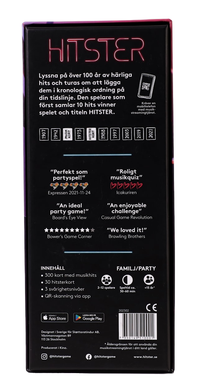 Spelet är enkelt: välj ett musikkort, skanna QR-koden via den kostnadsfria Hitster-appen för automatisk uppspelning via Spotify, gissa låtens releaseår och placera kortet på tidslinjen. Vänd kortet för att se om du placerat det korrekt. Tre svårighetsnivåer gör spelet roligt och utmanande för alla spelare.