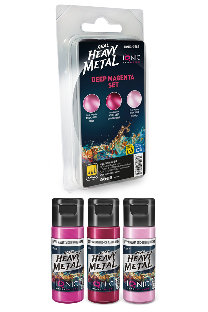 Real Heavy Metal Deep Magenta Set från Ionic Smart Colors är det perfekta valet för hobbyister som vill skapa en fyllig, kromatisk och sammanhängande metallisk finish med djupa magentatoner. Genom ett logiskt 3-stegssystem förenklas arbetsprocessen avsevärt, vilket ger dig konsekventa och iögonfallande resultat på allt från utomjordiska rustningar till magiska rustningsdelar.