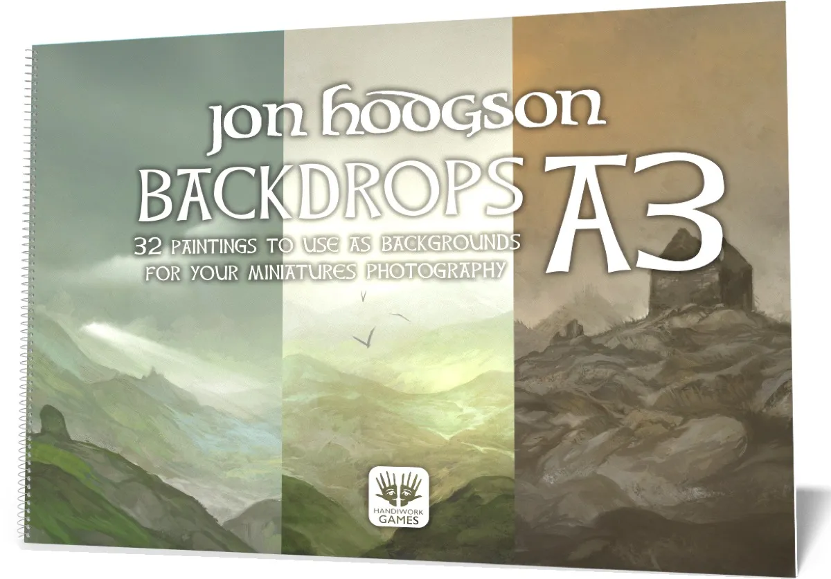 Jon Hodgson Backdrops Book One A3 tar dina figurfoton till en helt ny skala. Denna bok innehåller samma 32 hyllade handmålade landskap som originalboken, men nu i ett generöst A3-format. Det större formatet är speciellt framtaget för dig som fotograferar större modeller, stora monster, flygande enheter eller hela grupper av miniatyrer där en vanlig A4-sida helt enkelt inte räcker till för att täcka bakgrunden.