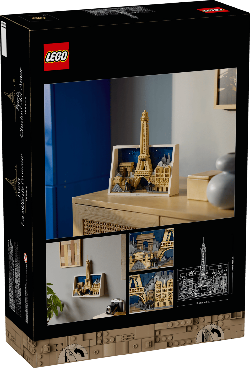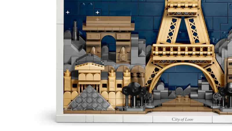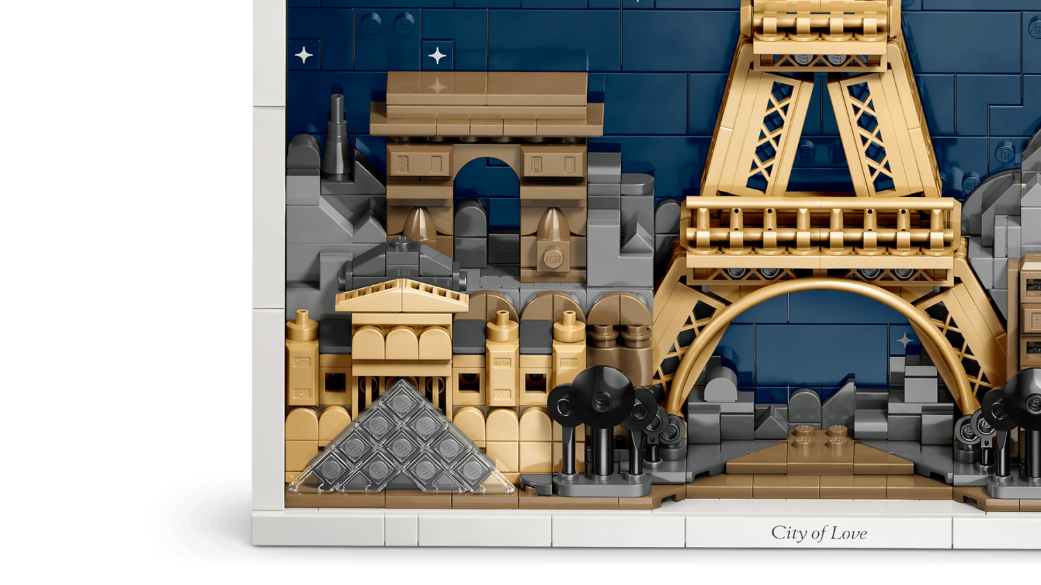 Det inramade setet kan ställas på en hylla eller hängas på väggen och fulländas med en kloss med texten ”City of Love”. Byggsetet erbjuder en lugn och kreativ byggupplevelse och är perfekt som present till vuxna som älskar arkitektur, resor eller Paris.