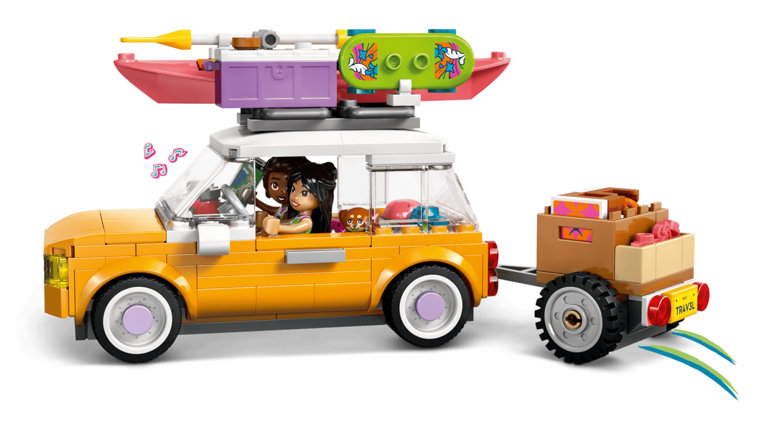 LEGO® Friends 42659 – Bilresa med vänner med 2 minidockor, valpfigur, bil med släp och roliga tillbehör för barn från 6 år.