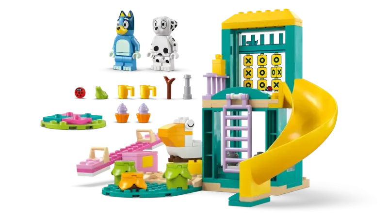 Färgglad LEGO® Bluey lekplats med minifigurer, rutschkana, gungbräda och roliga aktivitetsområden för barn från 4 år.