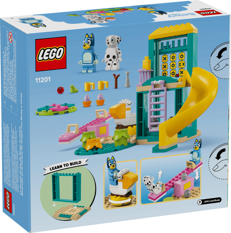 LEGO® Bluey: Skoj på lekplatsen med Bluey och Chloe (11201) är en interaktiv bygg- och lekplats för barn från 4 år, inspirerad av den populära tv-serien Bluey. Setet innehåller minifigurerna Bluey och Chloe, en färgglad lekplats med rutschkana, gungbräda, klätterställning, snurrande pelikankarusell, ett torn med teleskop och ett picknickområde med drycker och kakor.