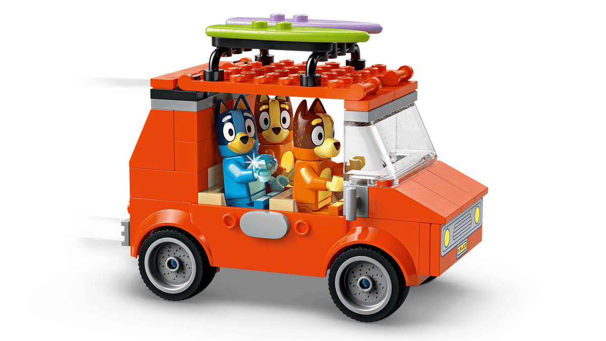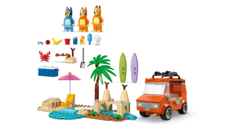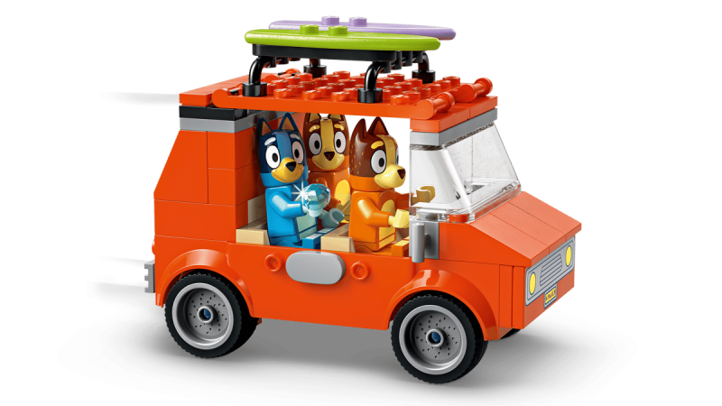 LEGO® Bluey familjetur till stranden med fordon, minifigurer och roliga strandaktiviteter för barn från 4 år.