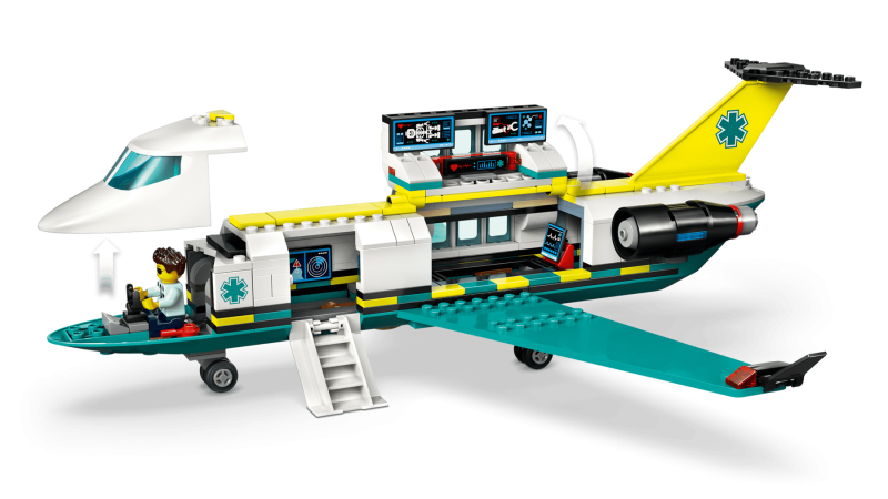 LEGO® City Ambulansflygplan låter barn från 6 år ge sig ut på actionfyllda räddningsuppdrag i luften. Det tvåmotoriga planet har nedfällbara flygplanstrappor och ett utfällbart medicinskt labb för realistiska lekscener.