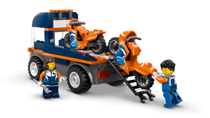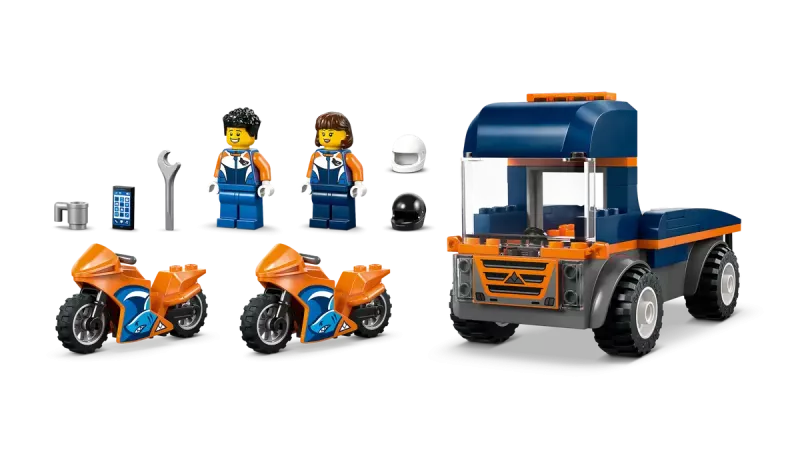 Detta lekset innehåller en flakbil med ramp, två sportiga motorcyklar och två minifigurer med hjälmar. Extra tillbehör som skiftnyckel, mugg och smartphone gör leken mer levande. Barn kan utveckla sin motorik och problemlösningsförmåga samtidigt som de skapar egna racinghistorier.
