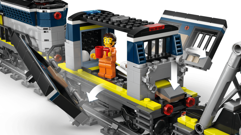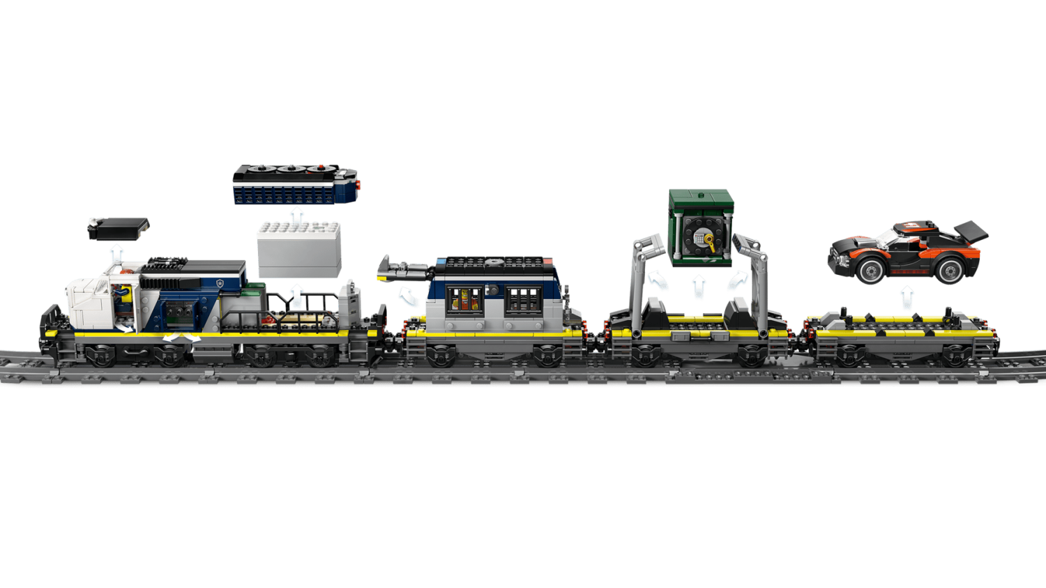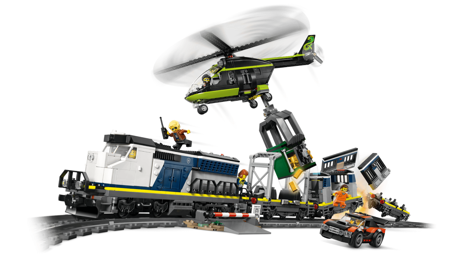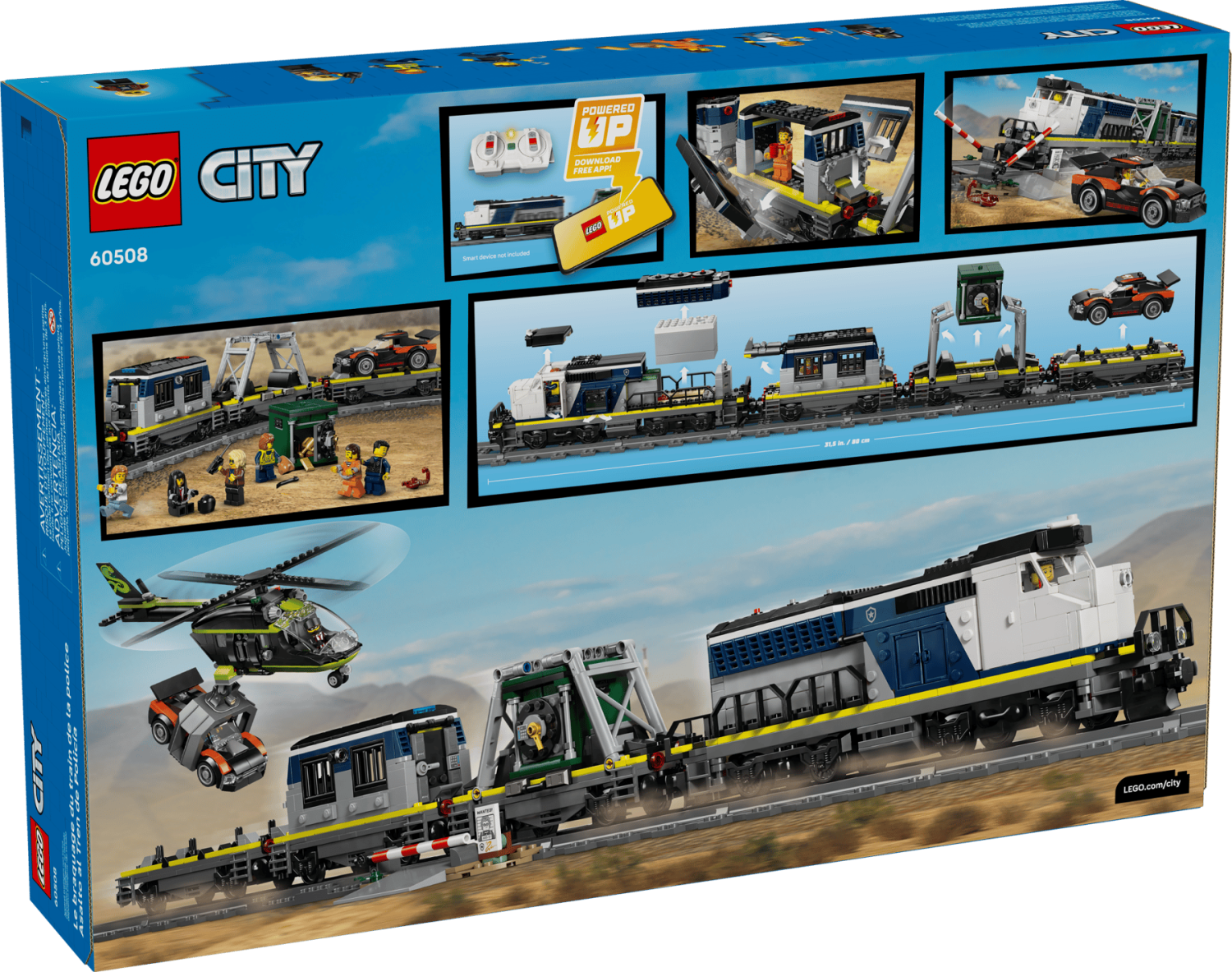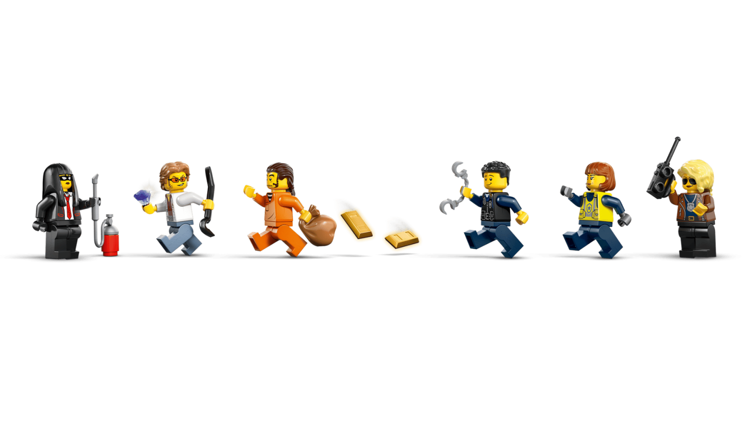 Setet innehåller sex minifigurer: en detektiv, en polis, en lokförare och tre skurkar. Barn kan iscensätta dramatik med gripklon på helikoptern som kan stjäla kassaskåpet, fängelsecellen eller rallybilen från polisens tåg. LEGO® Builder-appen erbjuder 3D-instruktioner, zoomning och rotation för att underlätta byggandet och ge en interaktiv upplevelse.