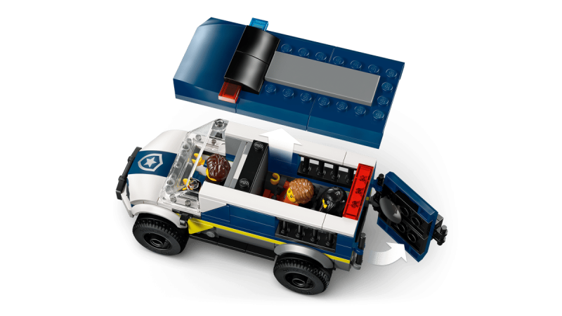 Setet innehåller en motorcykel med krok och kedja som kan användas för att dra upp celldörren. Barn kan sätta polisminifiguren i bilen, låsa in skurkarna och iscensätta kreativa rymningsförsök. Med appen LEGO® Builder kan barn zooma in, rotera och följa byggstegen i 3D för en trygg och rolig byggupplevelse.