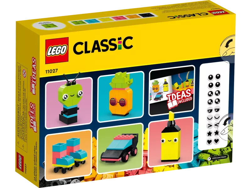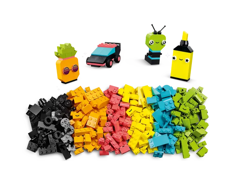 Detta mångsidiga byggset innehåller 333 klossar i olika storlekar och livfulla neonfärger. 18 av klossarna har uttrycksfulla ögon som barn kan använda för att väcka sina skapelser till liv. Setet innehåller tryckta bygginstruktioner till 5 roliga modeller – en ananas, en överstrykningspenna, en bil, en utomjording och rullskridskor – så att barn får det kreativa självförtroende de behöver för att bygga vad de än hittar på! Bygginstruktionerna finns dessutom i en digital version i appen LEGO Builder.