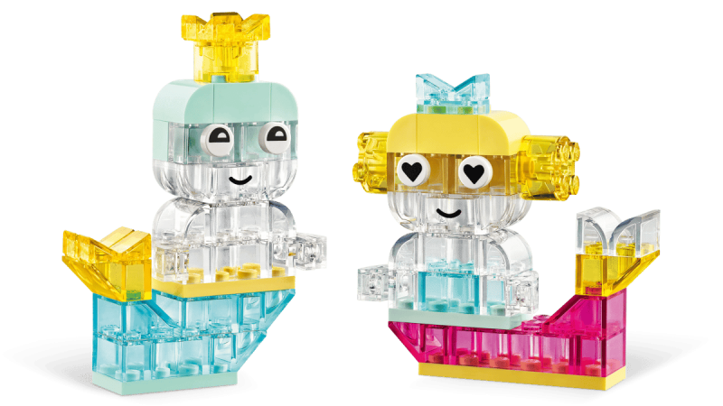 Börja med att bygga ett hjärta, spöke, sjöjungfru, stjärna och enhörning. När barnens självförtroende växer kan de skapa ett rymdskepp, moln, stjärnfall, fågel, narval, glass och blomma, samt utöka lekarna med ett stort slott och en drake. Upphängningsklossar, ögon och munnar ger extra kreativitet och glans till varje modell.