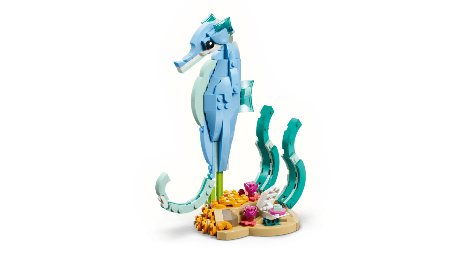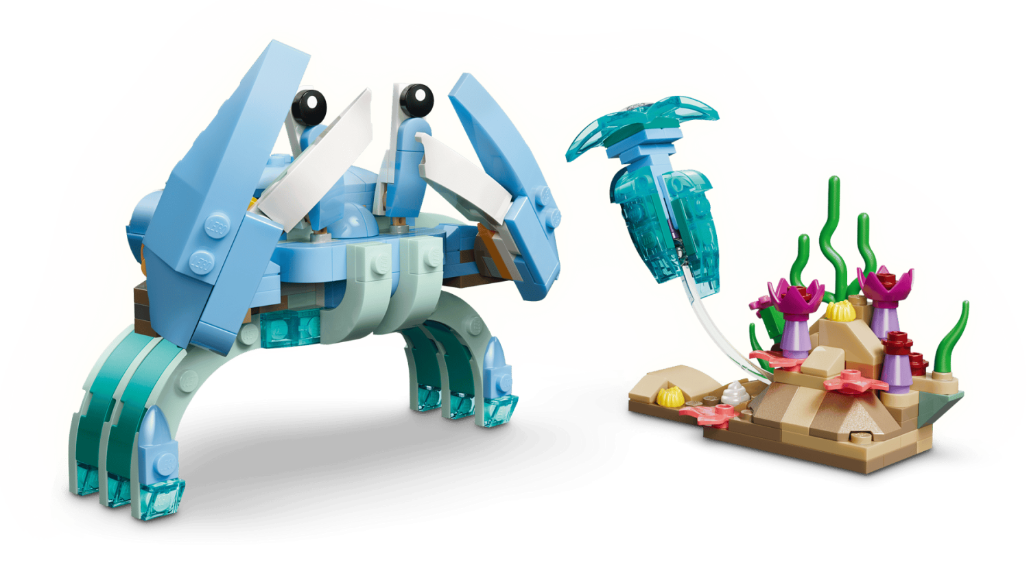 Delfinerna har rörliga fenor och stjärtar, sjöhästen kan röra huvud och stjärt, och krabban har rörliga ögon och klor. Setet innehåller 542 delar och kan byggas med hjälp av appen LEGO Builder, där barn kan zooma, rotera och följa sina framsteg i 3D.