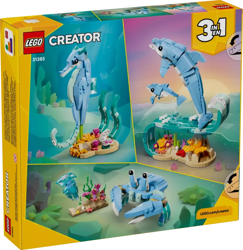 LEGO® Creator 3-i-1 Havsdjur: vackra delfiner™ låter barn från 9 år bygga och leka med 3 olika havsdjur med samma klossar. Barn kan skapa en vuxen delfin och en delfinunge, en sjöhäst med rörlig mussla eller en krabba med havsväxter och manet.