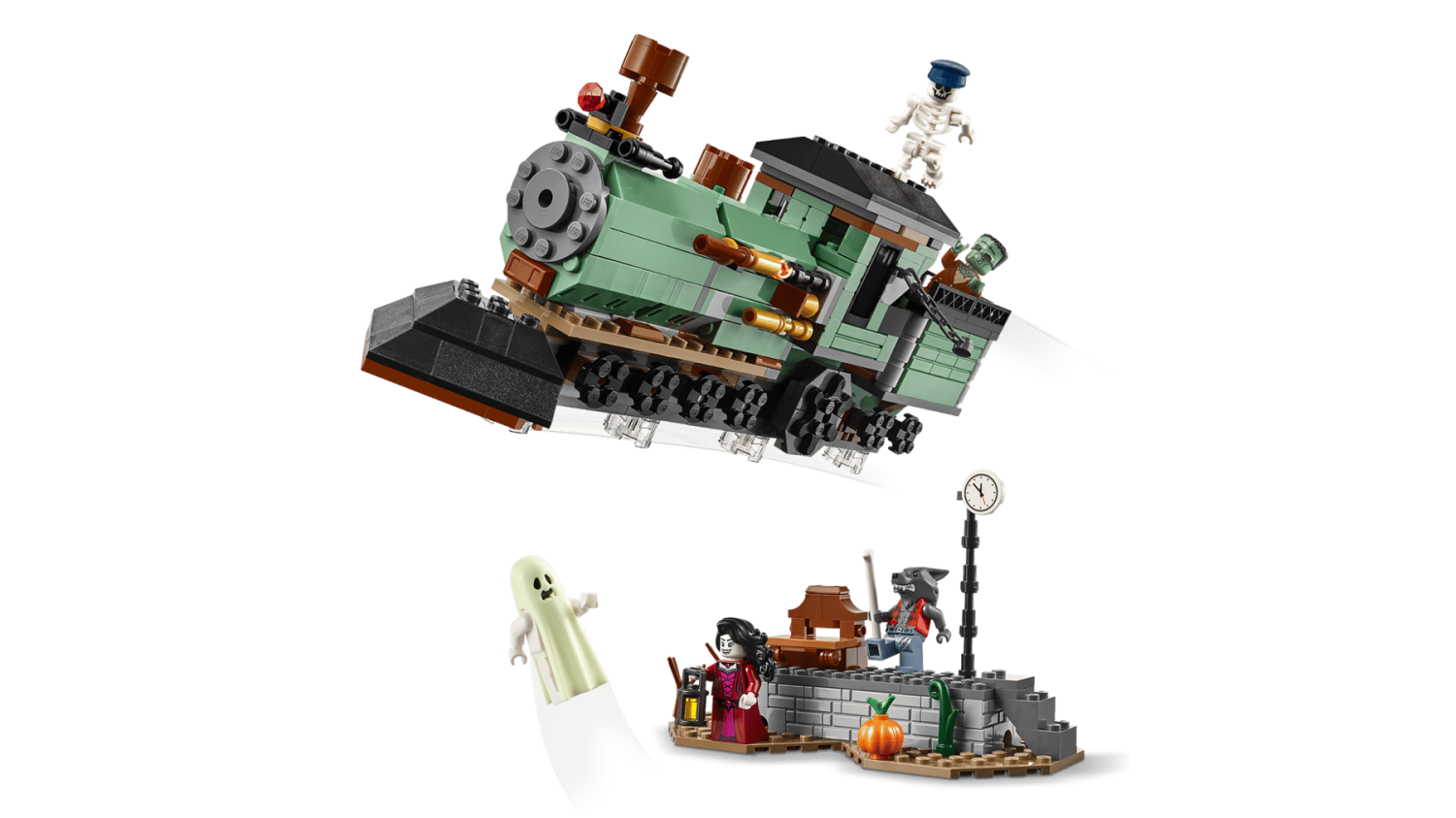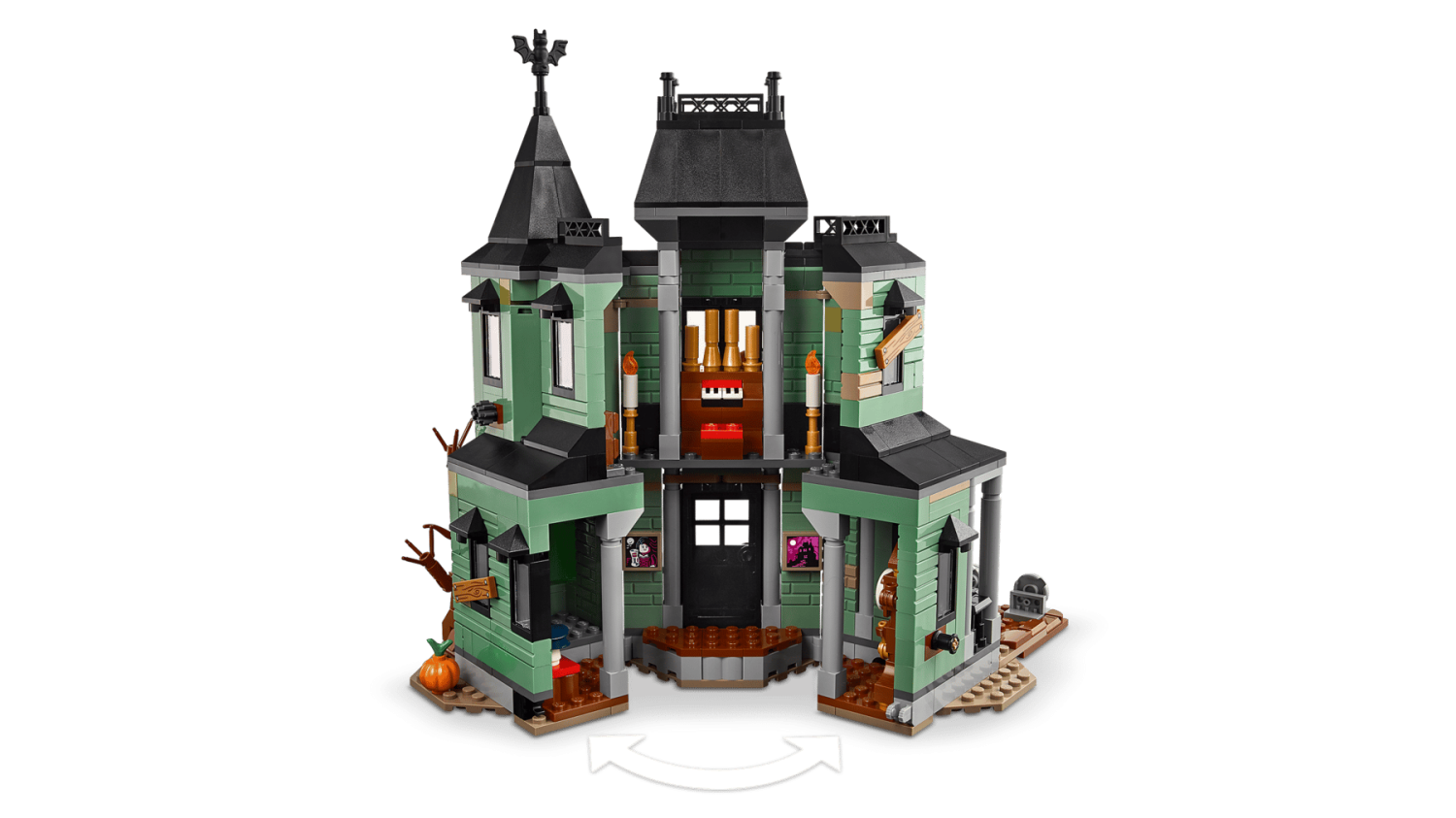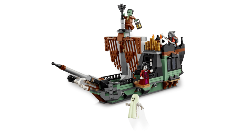 Det två våningar höga spökhuset har massor av roliga funktioner, inklusive en öppningsbar grind, en gravplats, ett avtagbart kusligt träd, en orgel, ett dolt spöke som avslöjas med ett vridbart hjul och en öppningsbar baksida för fler lekmöjligheter. Setet innehåller 5 minifigurer: varulv, vampyr, spöke med självlysande mantel, Frankensteins monster och ett skelett.