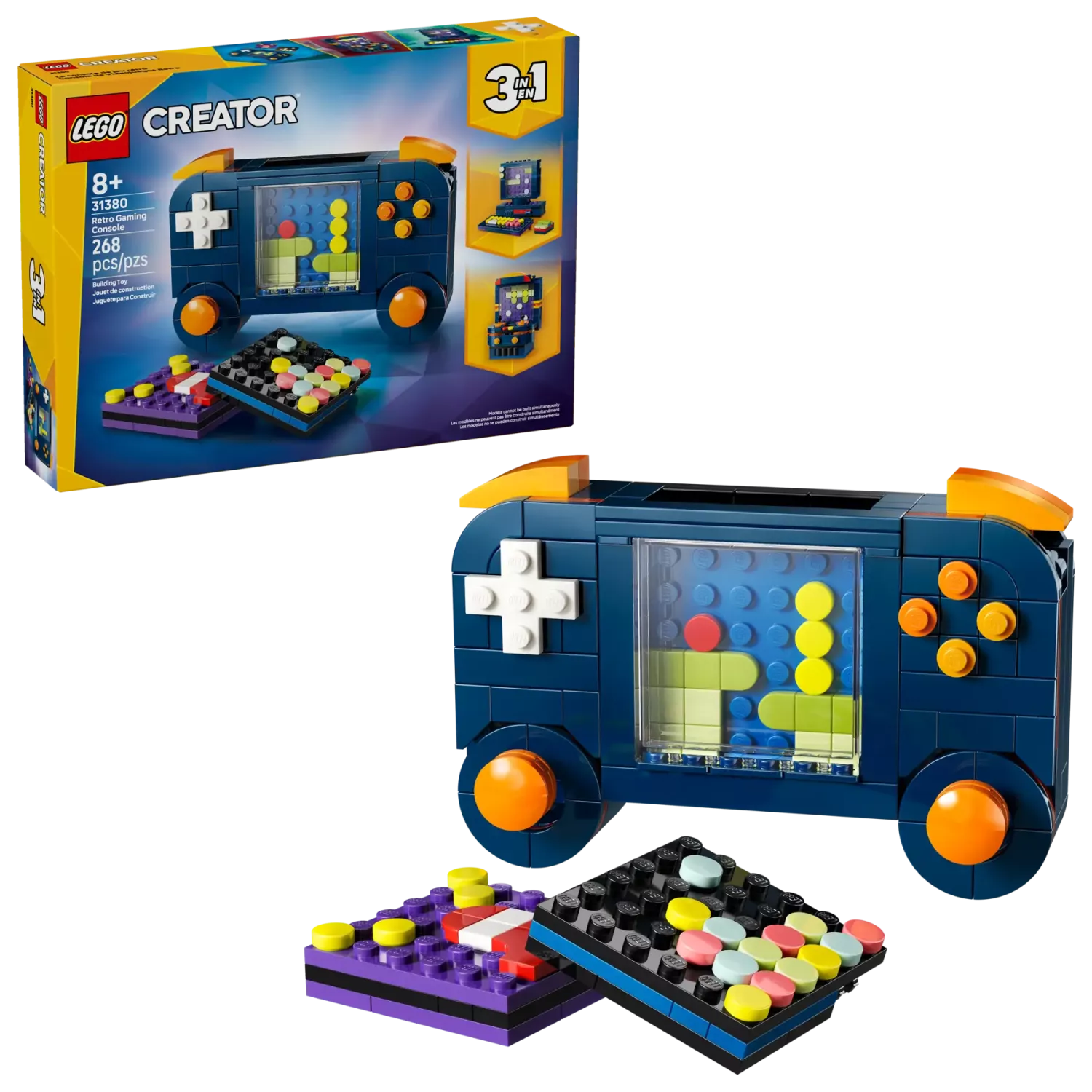 LEGO Creator 3-i-1 Spelkonsol i retrostil (31380) är ett byggset med 268 delar som låter barn från 8 år skapa och leka med tre olika modeller: handhållen spelkonsol, minidator och arkadspel.