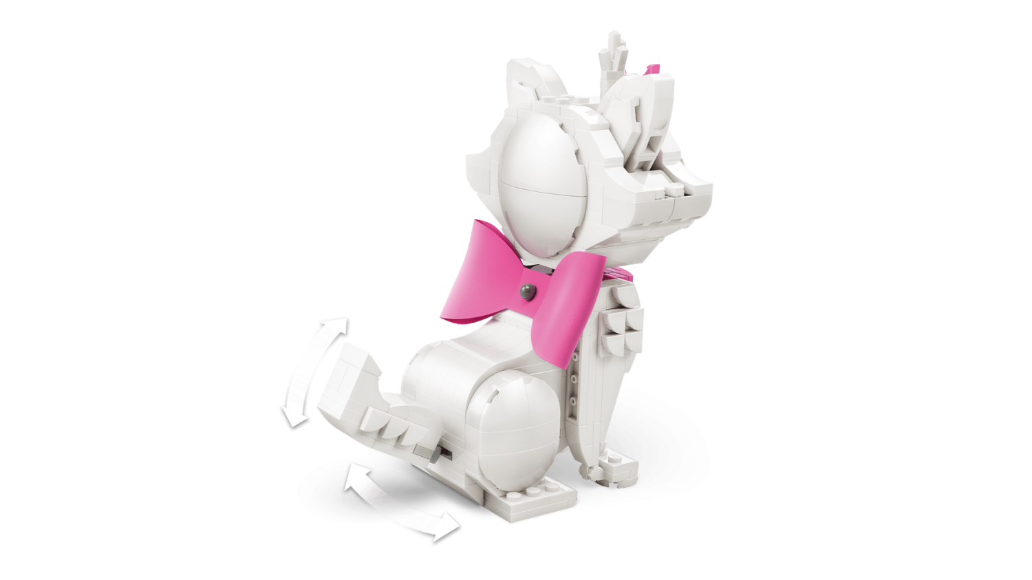 Bygg Marie med vridbart huvud, rörliga tassar, svans och öron. Barn kan placera henne i olika ställningar och sätta på eller ta av den rosa rosetten. Perfekt för rollspel, lek eller som dekorativ minifigur.