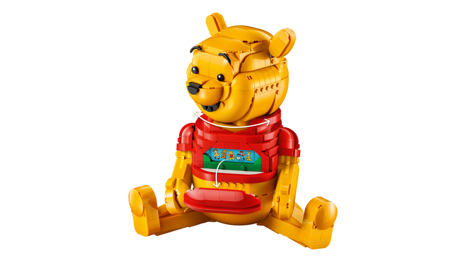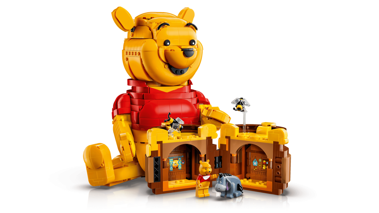 Honungsburken kan öppnas för att avslöja två dolda rum och extra byggbara detaljer. Barn och vuxna kan placera Nalle Puh i olika ställningar, vrida hans huvud, flytta öron och armar, och utforska de små överraskningarna i setet. LEGO® Builder-appen erbjuder 3D-instruktioner för att zooma, rotera och spara byggprojekt under hela byggprocessen.