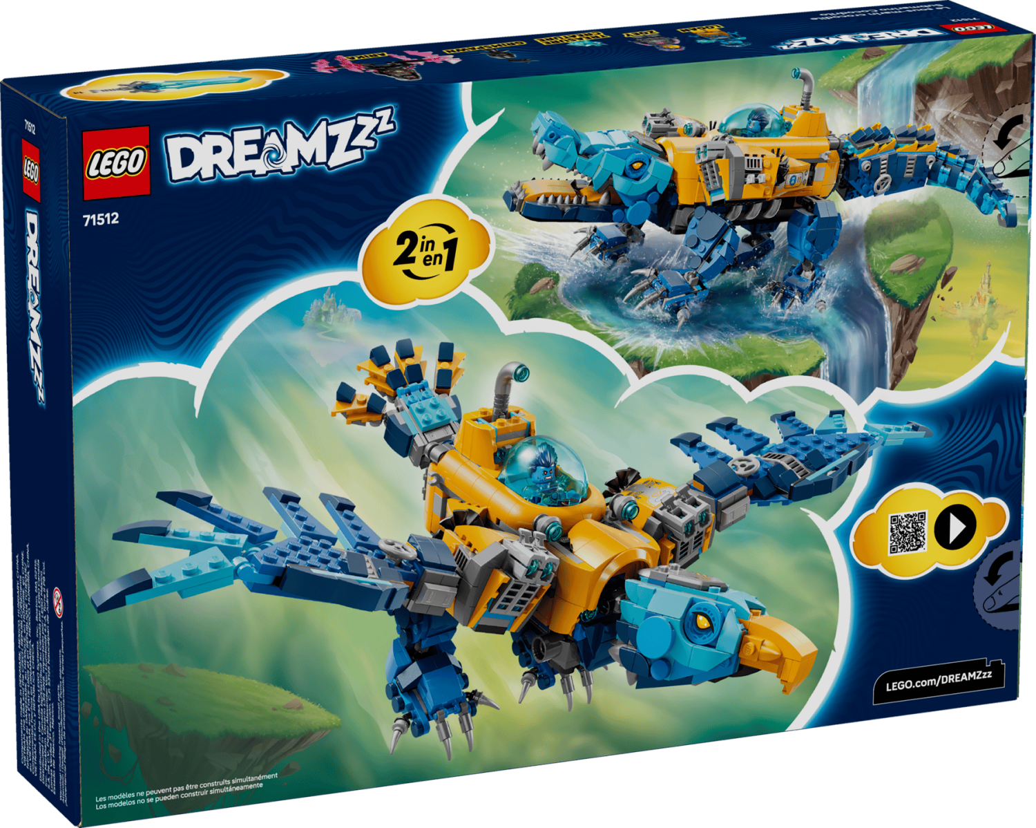 LEGO® DREAMZzz™ Krokodilubåt (71512) låter barn från 8 år bygga, leka och skapa äventyr med 1 107 delar. Setet erbjuder två byggalternativ: en krokodilubåt med rörliga ben, huvud och svans, eller en flygande örnubåt med rörliga vingar och raketer.