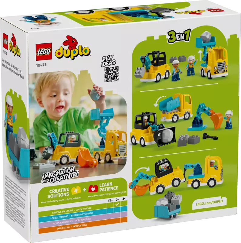 LEGO® DUPLO® 3 i 1 Byggfordon är utformat för små barns behov med stora, färgglada klossar som är enkla att hantera. Genom att bygga och experimentera med olika lastbilar utvecklar barn problemlösningsförmåga, kreativitet, finmotorik och uthållighet. Setet ger möjlighet att återskapa vardagsscener, leka rollekar och upptäcka hur saker fungerar i byggvärlden.