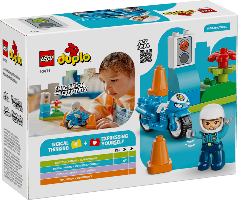 LEGO® DUPLO® set är speciellt utformade för små barns behov med stora, färgglada klossar och enkla, roliga karaktärer. Med detta set kan barn öva finmotorik genom att placera polisen på motorcykeln och köra runt konerna, samtidigt som de lär sig om trafiksäkerhet med det byggbara trafikljuset. Setet är testat för små barns säkerhet och passar perfekt som födelsedagspresent eller överraskning.