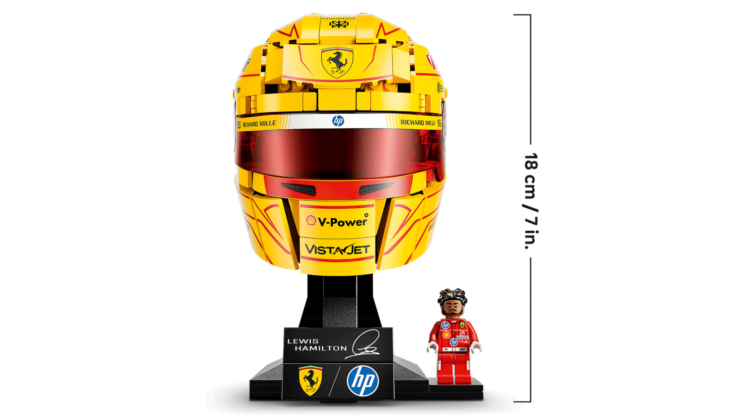 Hylla legenden! LEGO® Scuderia Ferrari HP Lewis Hamilton hjälm i Modena-gult. Inkluderar minifigur och signaturskylt. Ett ikoniskt samlarobjekt! 884 d