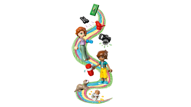 - Två LEGO Friends minidockor: Autumn och Leo är redo för äventyr, tillsammans med illern Bandit och en fågelfigur.