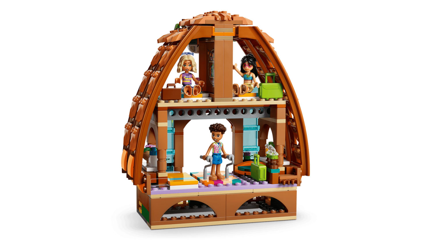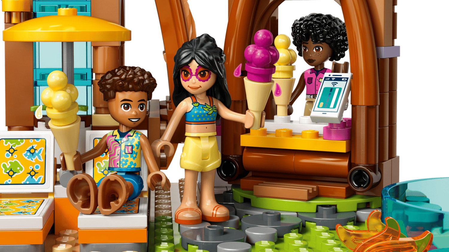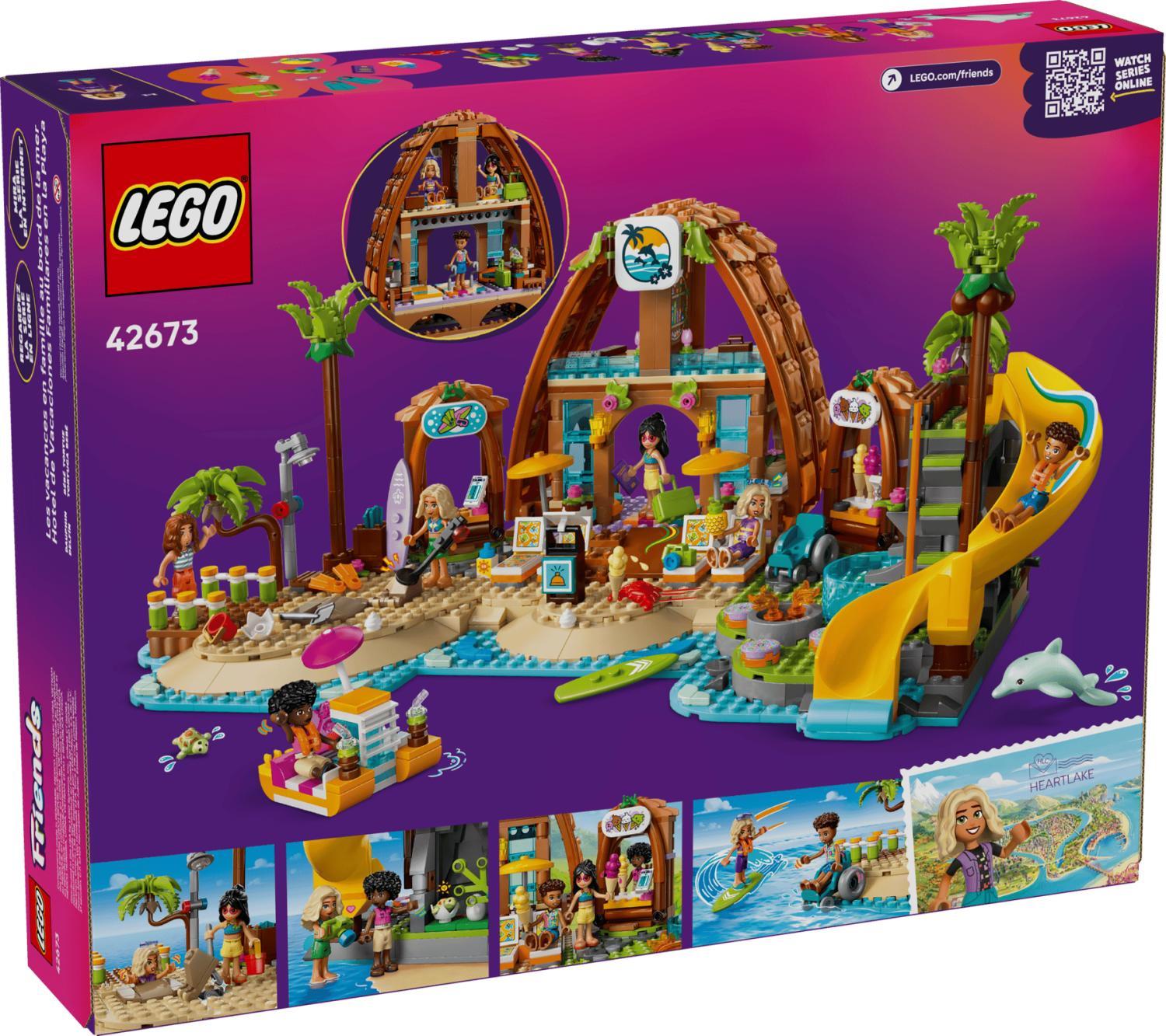 LEGO® Friends Familjesemester på strandresort 42673 – byggbar resort med 6 minidockor, delfin, sköldpadda och roliga strandlekar.