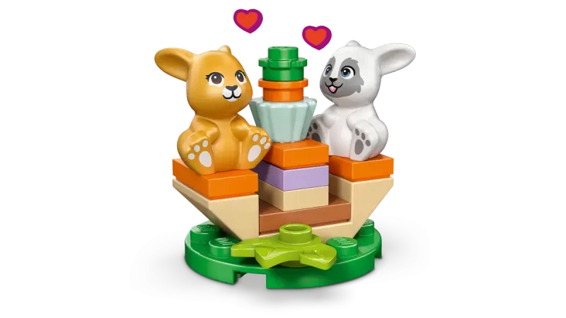 Setet innehåller två kaniner, ett mysigt hotell med sovplatser, utomhusplats för lek och många små tillbehör som borste, garnboll, mat och vatten. Barn kan leka kreativa berättelser om djurvård och vänskap samtidigt som de utvecklar byggfärdigheter och problemlösning.