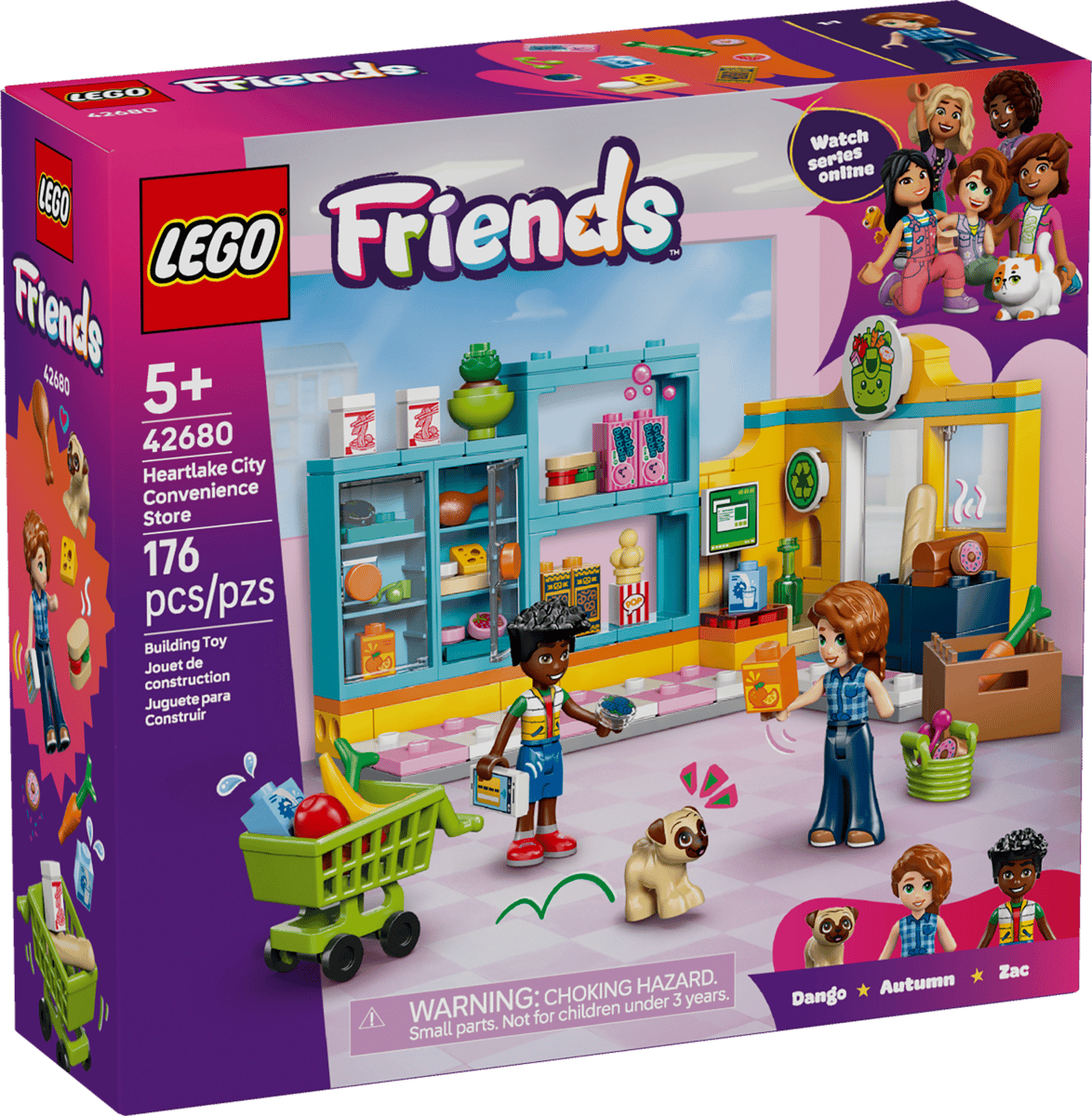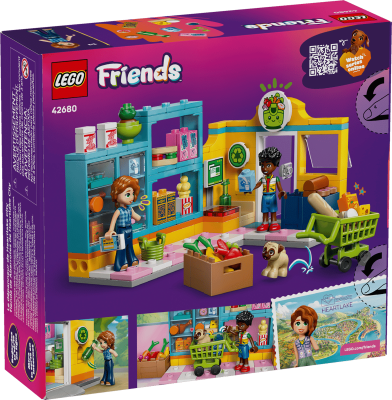 LEGO® Friends Heartlake Citys närbutik (42680) låter barn från 5 år inspireras till roliga lekar med matinköp och kreativt berättande. Setet innehåller en butik med hyllor, kundvagn, korg, återvinningsstation och kassaapparat, samt minidockorna Autumn och Zac, en leksakshund och massor av låtsasmat.