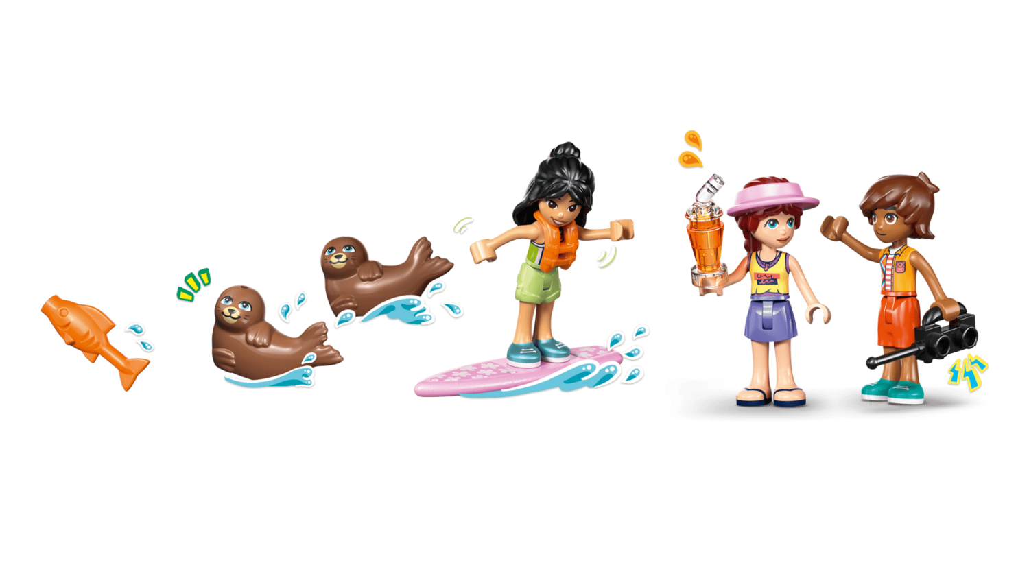 Setet innehåller 3 minidockor – Leo, Liann och Paisley – samt 2 sälfigurer. Massor av roliga tillbehör medföljer: surfbräda, kajak, hängmatta, flytväst, walkie-talkies, kikare, solkräm, kamera, snacks och mer.