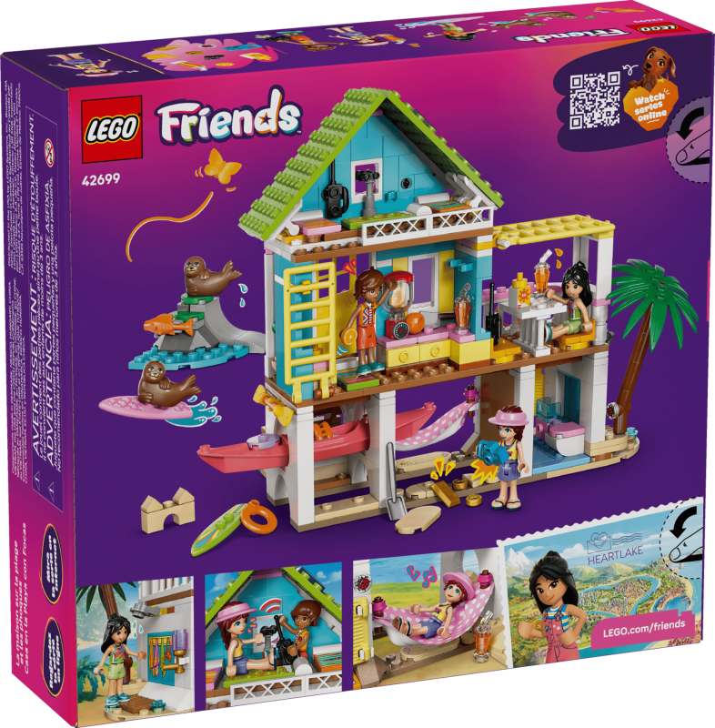 LEGO® Friends Strandhus 42699 – Byggset med 3 minidockor, 2 sälar, kök, sovrum, veranda, sandstrand och roliga tillbehör.