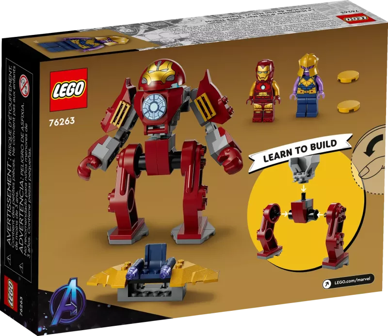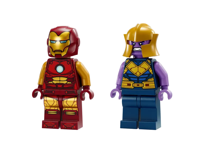 I detta lekset, som är baserat på Marvel Studios film Avengers: Infinity War, ställs superhjälten Iron Man och hans robot mot superskurken Thanos och hans flygplan. Hulkbuster är helt rörlig och har ett säte för minifiguren av Iron Man. Flygplanet har en fästbar skivkanon och ett säte för minifiguren av Thanos. Varje klosspåse i förpackningen innehåller en hel modell och en karaktär som barn kan bygga och leka med på en gång. En färgglad bildberättelse fungerar som bygg- och lekguide, och 2 startklossar i form av robotben gör byggandet enklare. För ännu mer digitalt skoj kan byggare zooma in, rotera set i 3D och följa sina framsteg i den roliga, intuitiva appen LEGO Builder.