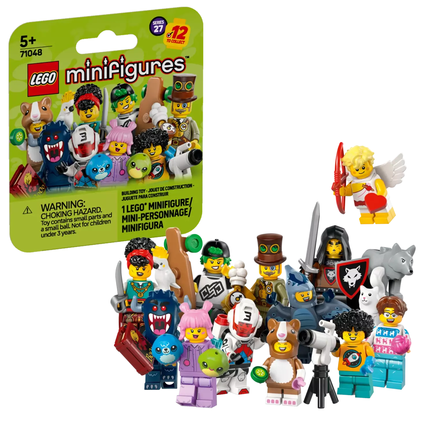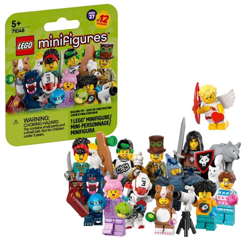 LEGO Minifigures Serie 27 innehåller 12 olika karaktärer som kan samlas och användas i fantasifulla berättelser. Bland figurerna finns vargflockens bestmästare, piraternas kvartermästare, steampunkuppfinnare, supporter i pterodactylusdräkt, nattmonster, jetpackracer, kattälskare, longboardåkare, astronomkille, Amor, supporter i hamsterdräkt och plyschdjurssamlare. Varje minifigur levereras i en förseglad hemlig låda för spännande överraskningar.