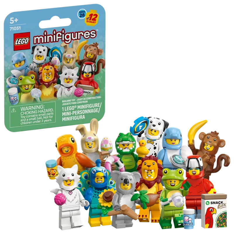 LEGO Minifigures Serie 28 – Djur innehåller 12 unika minifigurer, var och en levererad i en förseglad hemlig låda med minst ett tillbehör. Barn kan samla alla figurer, leka med dem och använda dem i kreativa berättelser. Bland figurerna finns papegoja, lejon, groda, krokodil, dalmatiner, guldfisk, söt kanin, påfågel, fluffig katt, koala, delfin och apa.