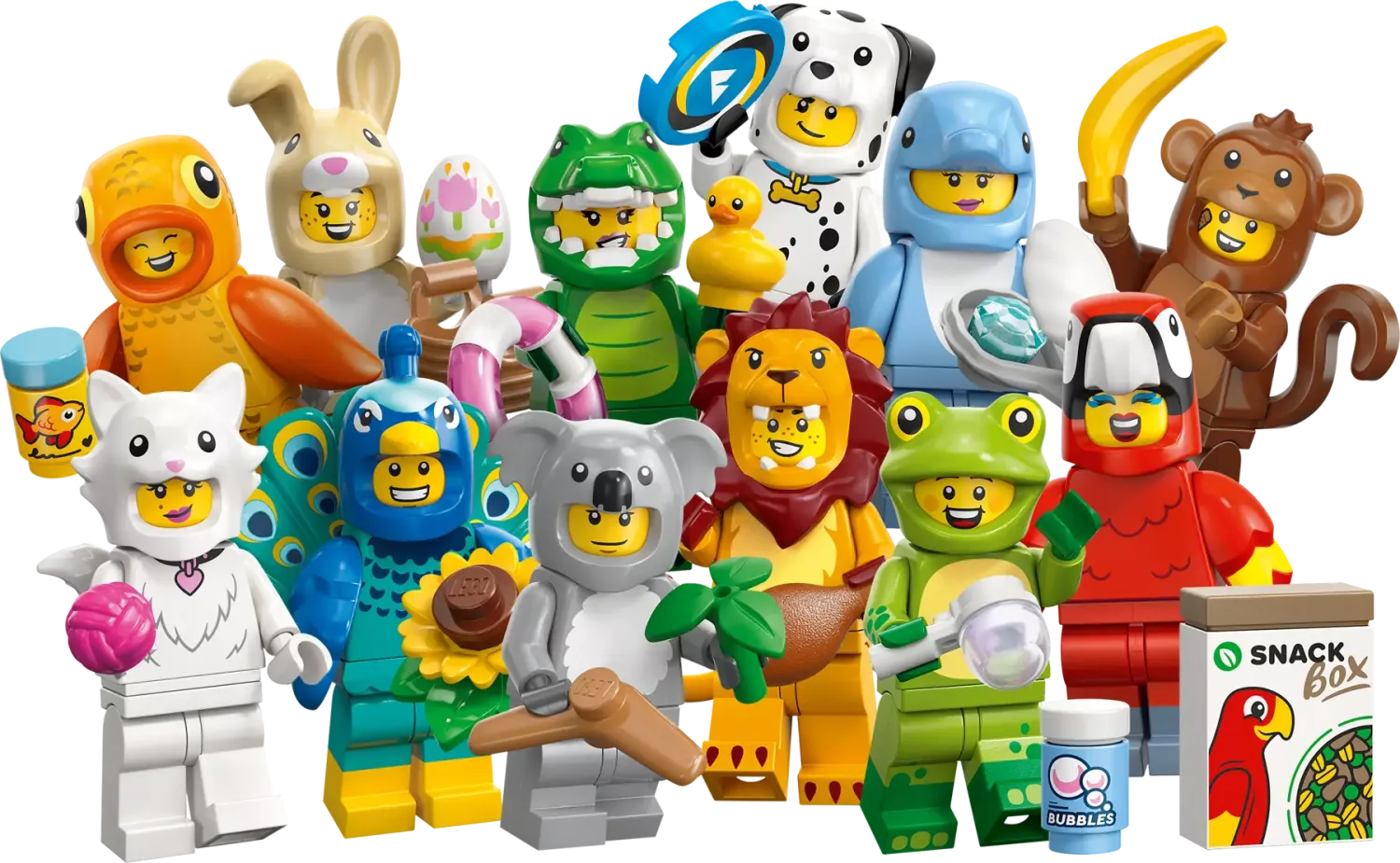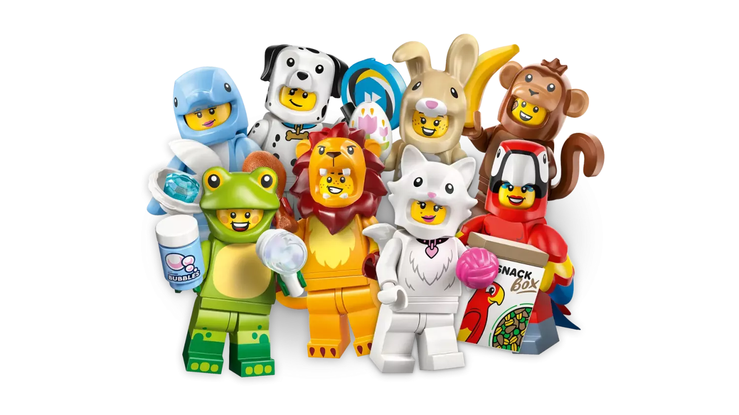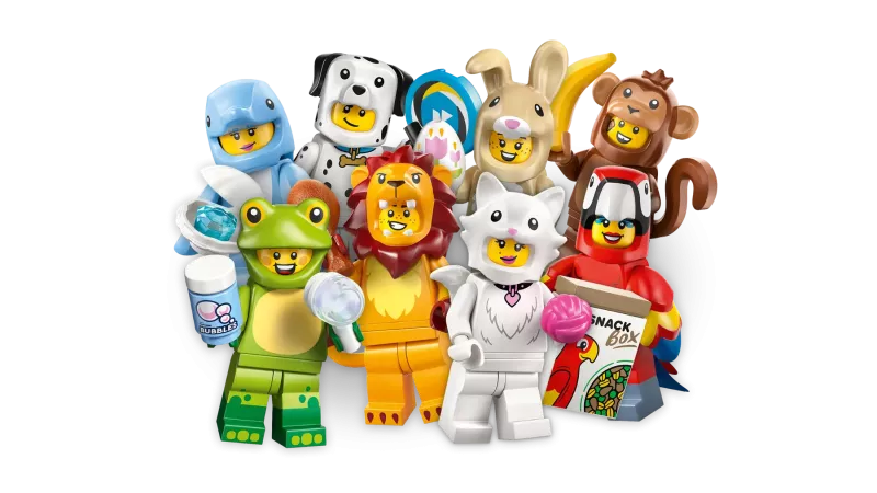 Varje minifigur har minst ett unikt tillbehör som inspirerar till lek och berättelser, exempelvis apan med en banan, dalmatinern med frisbee eller krokodilen med en gummianka. Figurerna är detaljrika, färgglada och designade för att passa både samlingar och lek.
