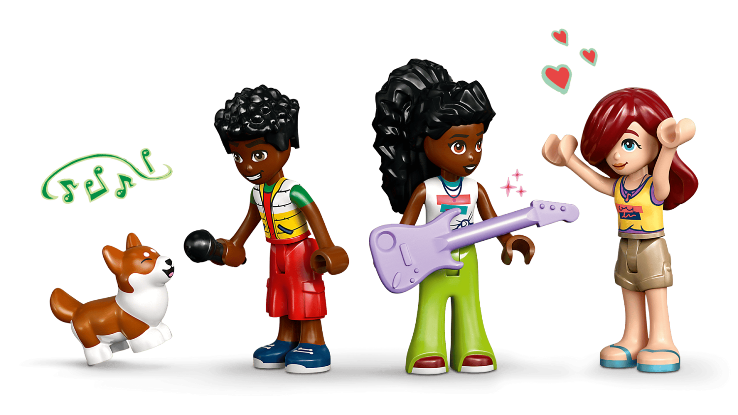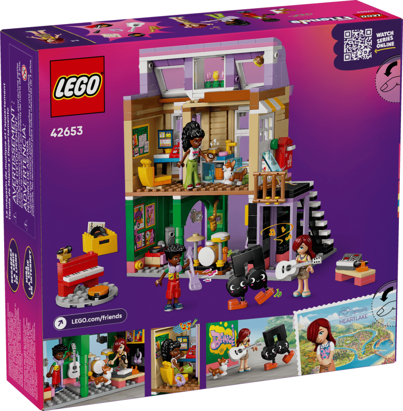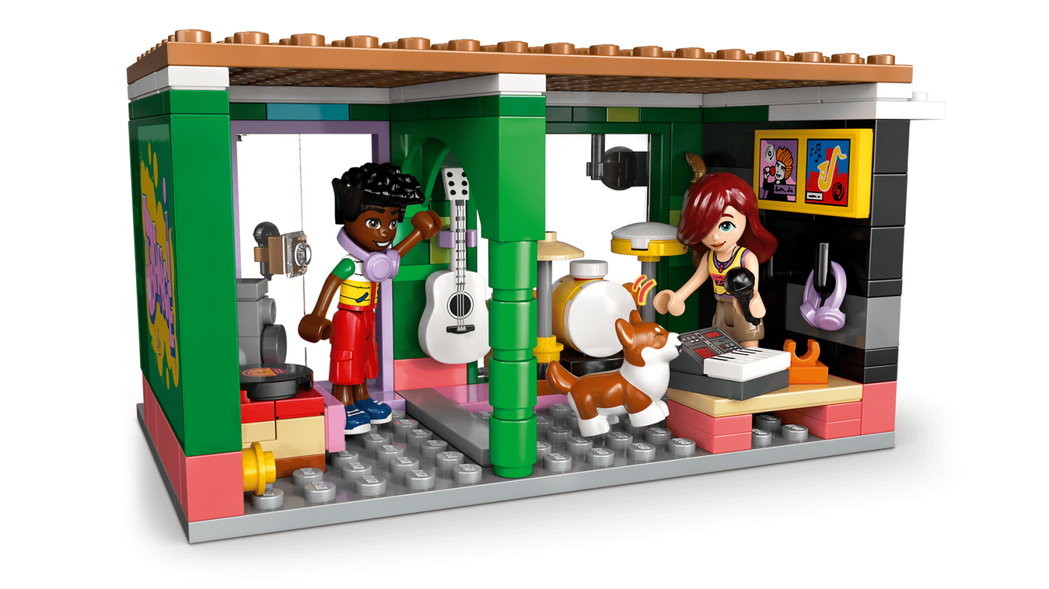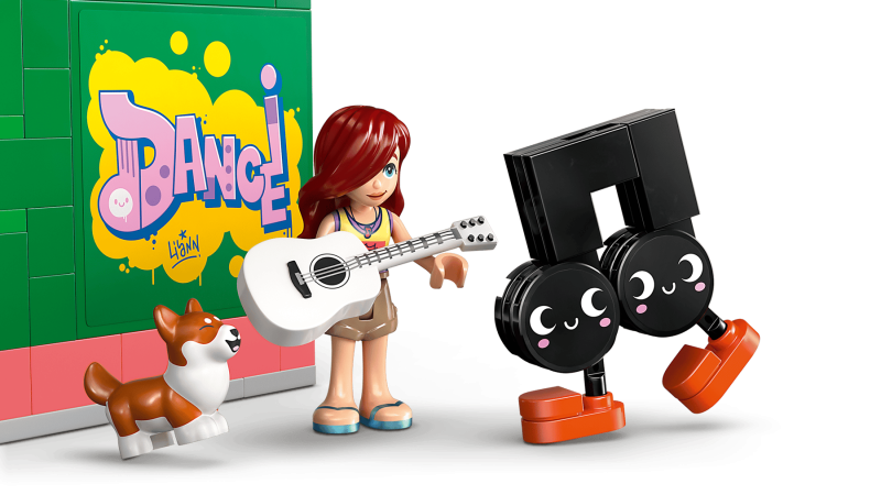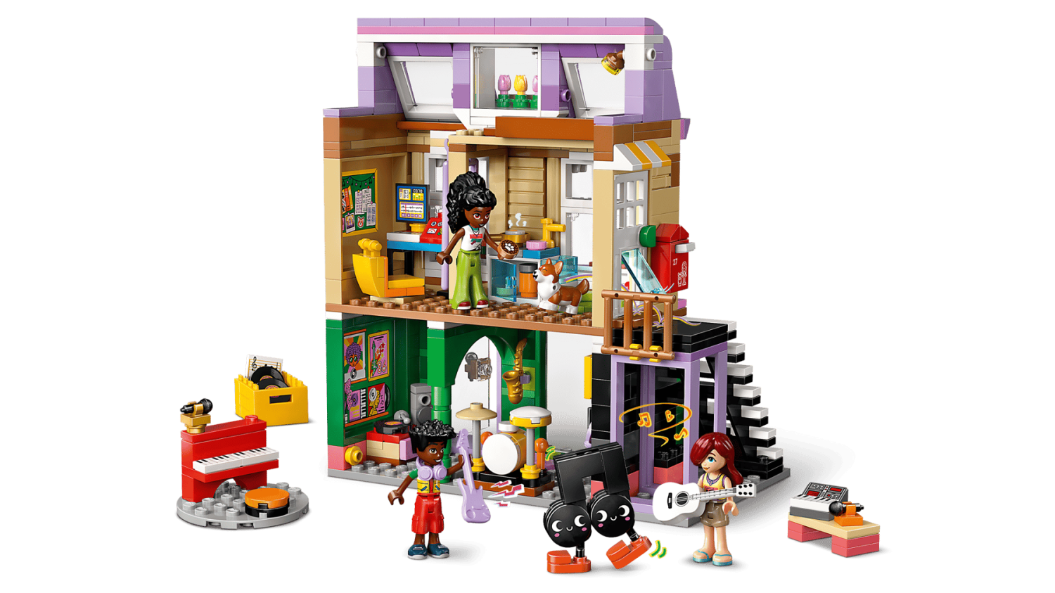 LEGO® Friends 42653 – Musikaffär & lägenhet med 483 delar, 3 minidockor, corgifigur och musikinspirerade tillbehör, från 7 år.