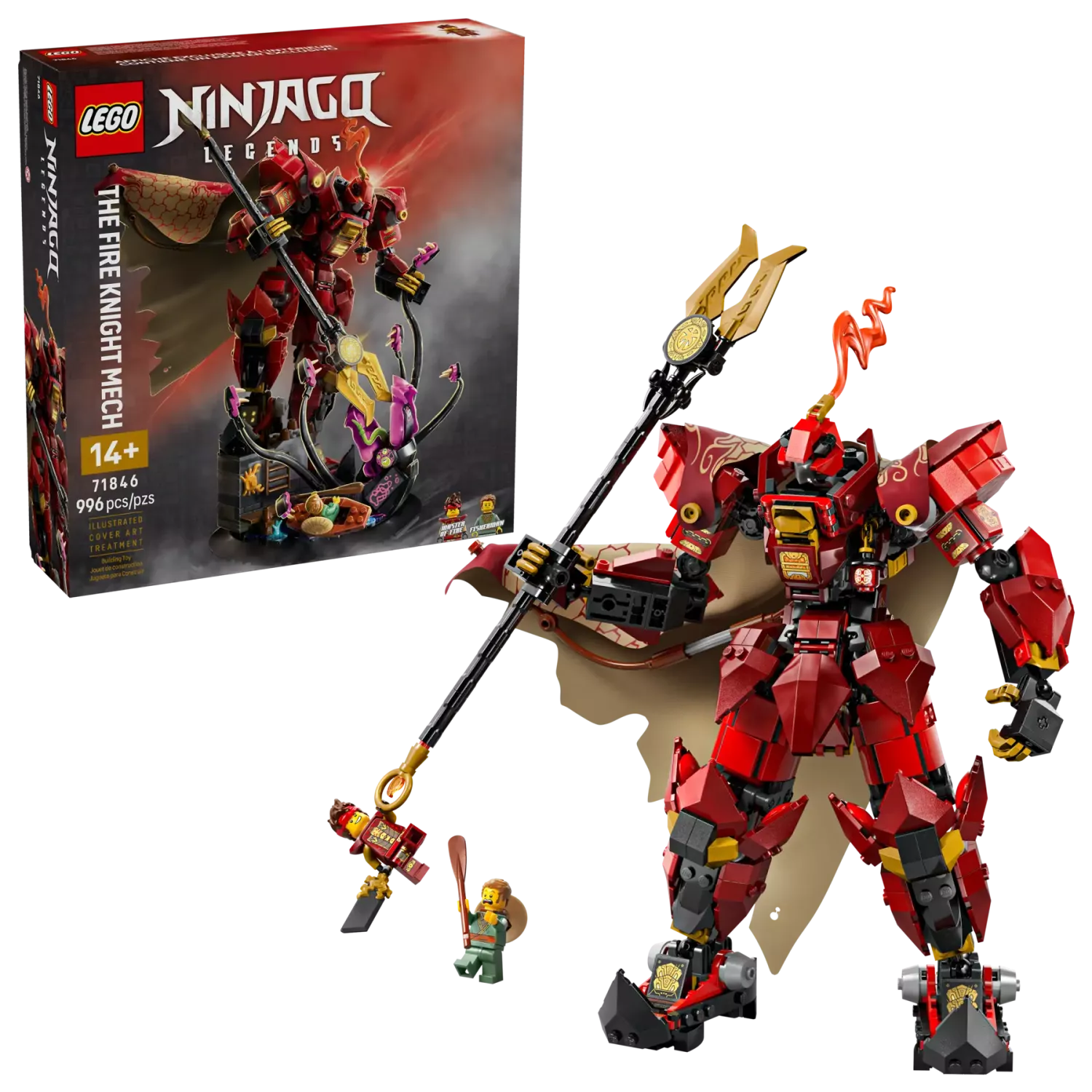 Setet innehåller 996 delar, inklusive två minifigurer: Kai med ett magiskt svärd som kan placeras i robotens bröstkorg och en fiskare med åra i en båt. Eldriddarroboten och monstret har rörliga funktioner, och modellen kan tas bort från basen för fler kreativa lekscener.